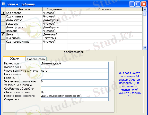 Конструктор режиміндегі кесте терезесі суретте көрсетілген. Терезенің жоғарғы жағында өрістерді, мәліметтер типі мен баяндауларды көрсеткен өрістердің жай тізімі болып табылатын кестенің жасалатын немесе жаңғыртылып, жетілдірілетін макеті тұрады.