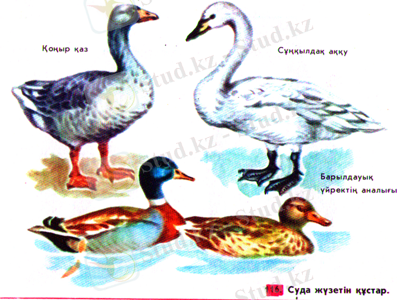 Суда жүзетін құстарға әр түрлі отрядтарға топтасқан көптеген құстар жатады. Екі отрядтың өкілдерімен танысамыз.