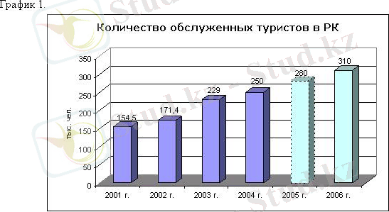 2003ж Қазақстандық тур фирмалар 44. 9 мың адамға қызмет көрсетті. Бұл алдыңғы жылға қарағанда 1, 5 есекелушілердің көп болғандығын көрсетеді. ТМД елдерінен басқа елдерден Қазақстанға 42. 2 мың адам келді(2002ж 28. 5мың адам) . Статистикалық мәліметтерге сүйене отырып келуші шетелдік туристер санының көбею динамикасы сақталғанын көреміз.