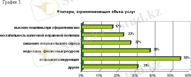 Көптеге туристік фирмалардың басшыларының айтуынша қызмет көрсету көлемінің шектеуші факторы нарықтағы бәсекелестіктің күшеюі болып табылады. Сауалнама берушілердің 27% сатып алушылар сұранысың төмендігін көрсетеді, ал 18% қызмет көрсету көлемінің өсуіне шектеу жоқ деп санайды.