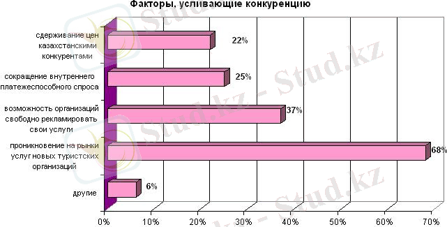 Туристік фирмалардың басшыларының 68%-ы бәсекелестікті күшейтуші негізгі факторы - нарыққа жаңа туристік ұйымдардың кіруі десе, 37% туристік агенттіктердің агрессивтік жарнамаларына байланысты дейді.