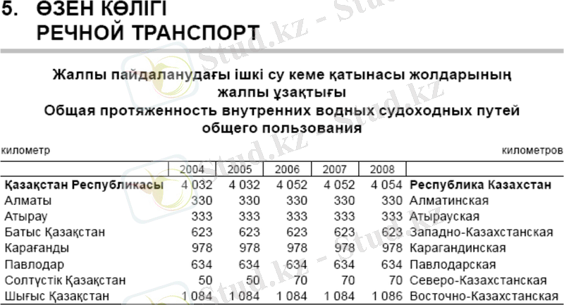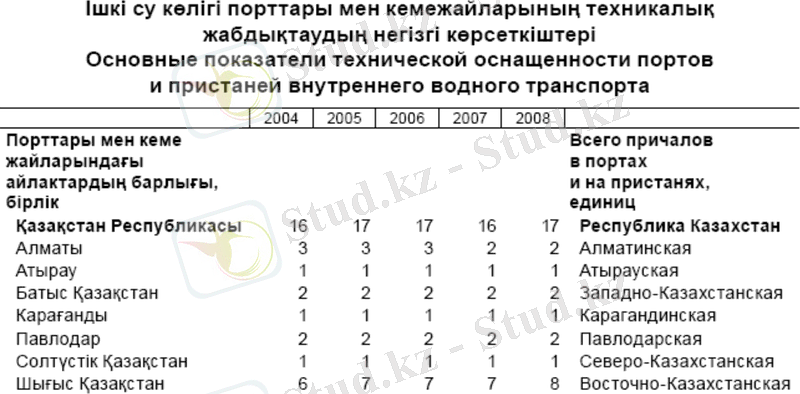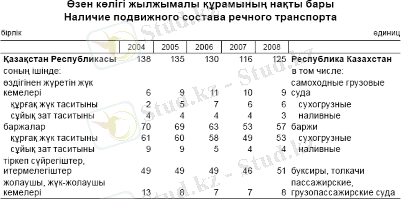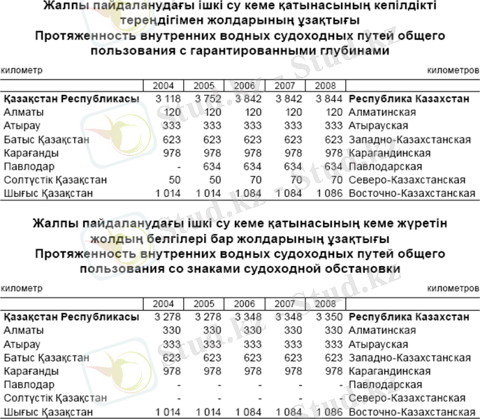 Ішкі кеме қатынасы үш су бассейнінде: Ертіс (1719, 5 км), Іле-Балқаш (1308 км) және Орал-Каспий (956 км), ұзындығы 3983, 3 км су жолы учаскелерінде жүзеге асырылады. 2007 жылы ішкі су көлігімен шамамен 1, 28 млн. тонна әртүрлі жүктер тасымалданды, бұл 2006 жылғы көрсеткіштерден 127, 1 % артық.