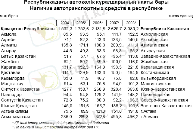 Автокөлік құралдарының республикалық паркі шамамен 1 745 мың жеңіл, шамамен 312 мың жүк АКҚ және 75 мың автобустардан құралады (ҚР ІІМ-нің 2008 жылғы 1 қаңтардағы жағдай бойынша деректері) .