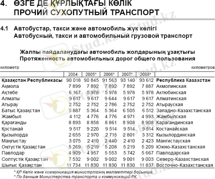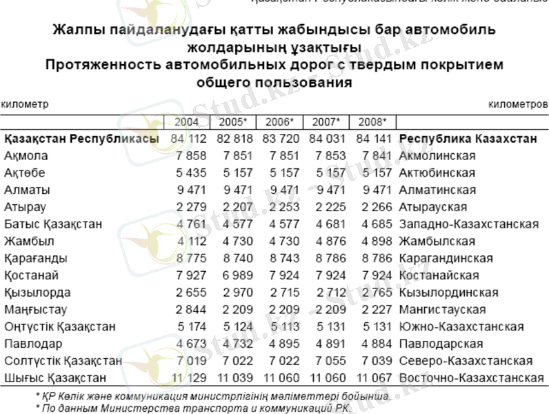 Қазақстан Республикасының автомобиль жолдарының ұзақтығы 128 мың км құрайды, оның 93 мың км астамы жалпы пайдаланудағы автожолдар. Жалпы пайдаланудағы автожолдардың жалпы ұзақтығының 23, 5 мың км республикалық маңызы бардағысы, 69, 5 мың км жергілікті желілерге жатады.