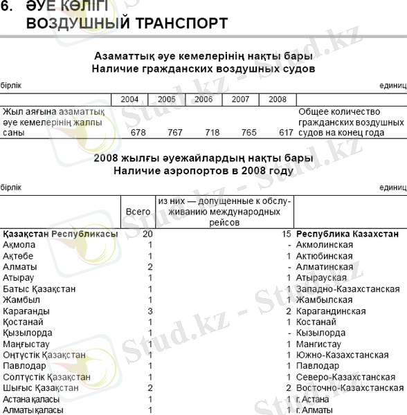 2007 жылы республика әуежайлары 5, 4 млн. жолаушыға қызмет көрсетті, өсімі - 34 % (2006 жылы - 4, 0 млн., 2005 жылы - 3, 3 млн. ) . Негізгі әуежайлар - Алматы және Астана (2, 7 млн. (2006 жылға 2, 0 млн. ) және 1, 2 млн. (0, 86) жолаушы, 2007 жылы жолаушы ағымының көлемі тиісінше 33 % және 36 % құрады) .