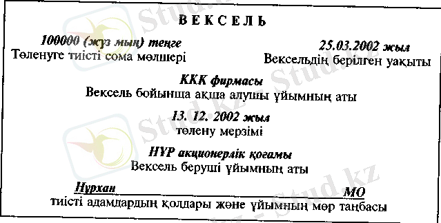 Вексель белгіленген қатал нысанында жазылған жазба-ша борышқорлық міндеттеме болып саналады. Вексель өзінің иесіне міндеттеменің мерзімі өткеннен кейін немесе мерзімінен бұрын вексельде көрсетілген соманы төлеуді талап етуге даусыз құқық береді. Вексельді толтырушы, яғни ол вексель бойынша төлем жүргізуге міңдет алған заңды немесе жеке тұлға вексель беруші деп аталады. Ал вексель бойынша толем алушы тұлға ремитент болып табылады. Вексельдің жалпы түрін мына төмендегі суреттен көруге болады: