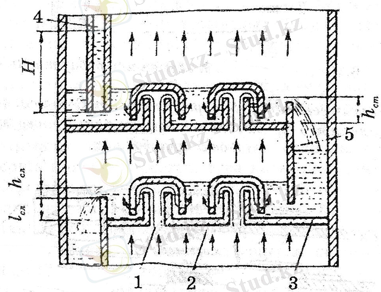 1-патрубок; 2-қақпақ; 3-табақша дискі; 4-құйылу құбыры; 5-құйылу қалқаны; Н-құйылыу стаканындағы сұйықтық деңгейінің биіктігі; һ ст - стакан биіктігі; һ сл -сұйықтықты ағызудағы сүйеу биіктігі; l сл - табақша үстіне шығып тұратын құйылцшы қалқаның бөлігі немесе құбыр биіктігі.