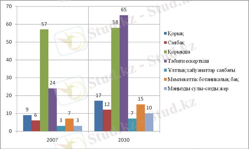 Қазақстанда 9 мемлекеттік табиғи қорық, 6 мемлекеттік ұлттық саябақтар, 57 қорықшалар, 24 табиғи ескерткіштер, 3 мемлекеттің ұлттық хайуанаттар саябағы, 7 мемлекеттік ботаникалық бақтар, 3 халықаралық маңызды сулы -сазды жер суы бар [5, ] .