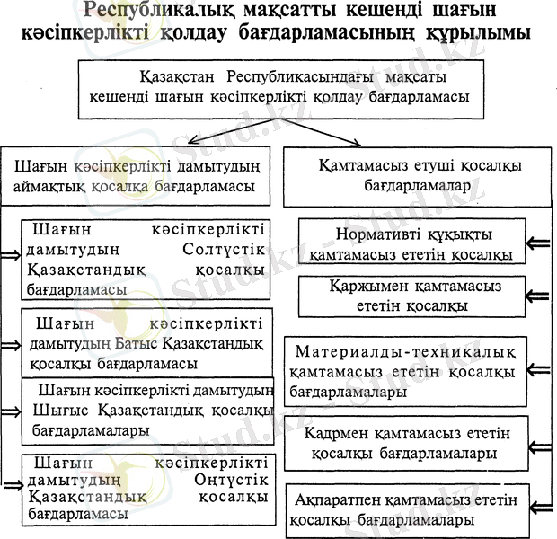 Республикалық шағын кәсіпкерлікті дамытудың кешенді бағдарламасының негізгі қосалқы бағдарламаларына аймақтық жөне жергілікті деңгейде дайындалған қосалқы бағдарламалар жатады. Шағын кәсіпкерліктің дамуын қамтамасыз ететін қосалқы бағдарламаларға - нормативті-құқықтық, қаржылық, материалды-техникалық және ақпараттық қамтамасыз ететін қосалқы бағдарламалар жатады. Бұл қосалқы бағдарламалардың соңғы мақсаты іске асыруға тікелей әсер етпеуіне қарамастан, олар оған қол жеткізу үшін барлық қажетті жағдайлар жасайды.