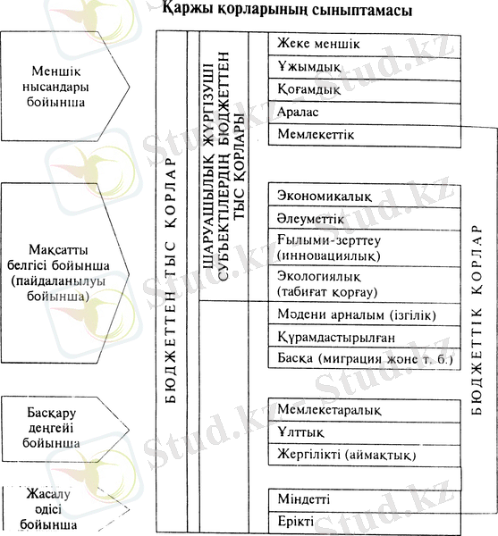Каржылық жүйесін сыныптаудың функциялық критерийінен басқа қаржы субъектілерінің (қаржы қатынастарындағы қатысушылардыңа) белгісі бойынша сыныптау қолданылады, бұл қаржы жүйесін сфералар мен буындар бойынша: мемлекетін қаржысына хашылық жүргізуші субъектілердің қаржысына халықтан (үй шаруашылығының) қаржысына шектеуге мүмкіндік береді