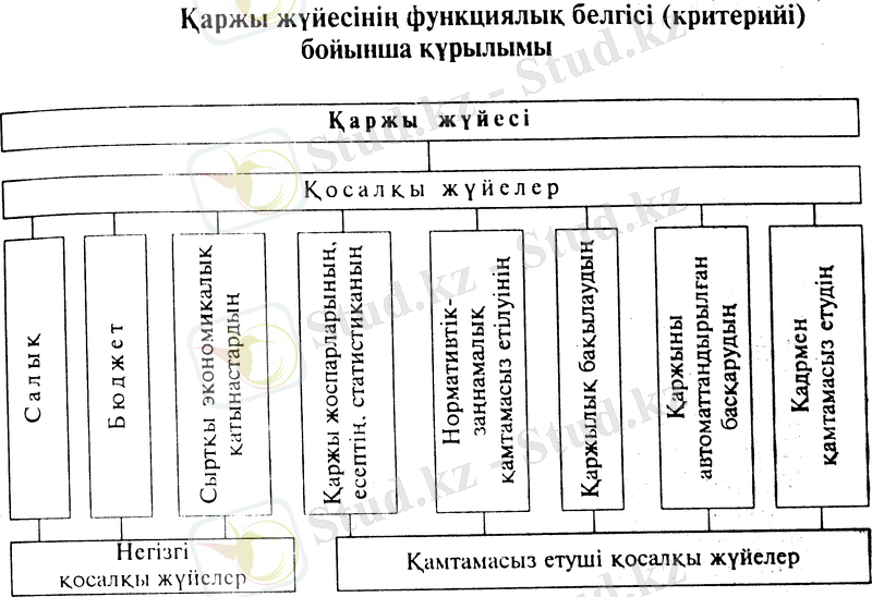 Қаржы жүйесі интеграциялық тұрпатты жүйе болып табылады, оған кіретін элементтердің (қосалқы жүйелердің) тығыз байланысымен жәнс оның қосалқы жүйелерінің бірде-бірі өзінше өмір сүре алмайтындығымен сипатталады: қаржы бір жағынан, өндірістік қатынастардың бір бөлігін білдіреді және осы қатынастар жүйесінің элементі болып келеді, екінші жағынан, өзінің функциялық өзіндік ерекшелігі бар өзара байланысты элементтерден тұратын жүйе болып табылалы. Функциялық сыныптауға сәйкес қаржыларда функциялық қосалқы жүйелер ретінде мыналарды айтуға болады: салық, бюджет, сыртқы экономикалық, қаржылық жоспарлаудың (болжаудың), каржылық бақылаудың және басқа қосалқы жүйелері