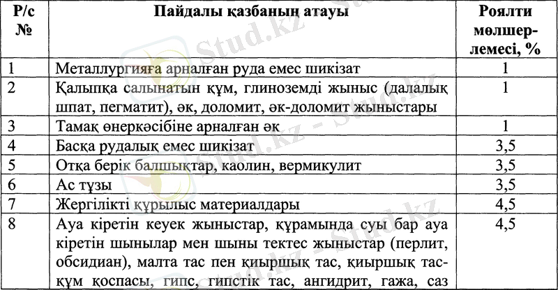 Кең таралған пайдалы қазбалар мен жерасты сулары бойынша роялти мөлшерлемесі % (пайызбен) белгіленеді және пайдалы қазбалар түріне байланысты болады.