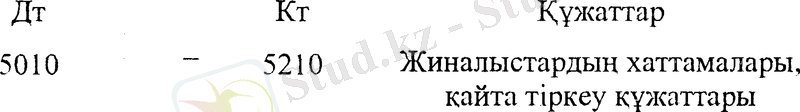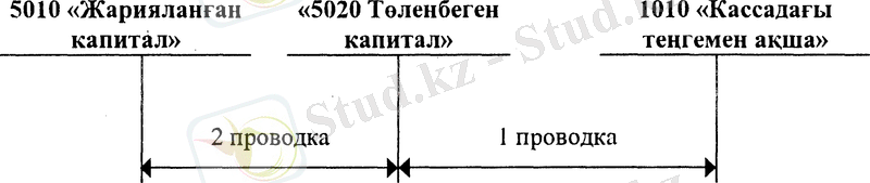 а) Капиталды жариялаудан (тіркеуден) . Бұл шаруашылық операциялар №5 «Капитал мен резервтер» бөлімінің пассивті шоттарында бейнеленеді. Жарияланған капитал құрылтайшылар мен қатысушылардың салымдары есебінен жарияланатындықтан, шаруашылық операция №5010 шоттың кредитінен №5020 шоттың дебетіне жасалады. Бухгалтерлік жазу төмендегідей болады: