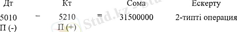 Жазудың дұрыстығын тексереміз: кредиттік жағында тек қана активті шоттар орналасқан. Бұл жағдайда баланстың активі мен пассиві кемитін 4-типті «Пассивті-активті» операция орын алады. Бір жағынан кәсіпорынның жарғылық капиталына қатысушылар салымының көлемі, екінші жағынан бір мезгілде сол сомаға оның ресурстары кемиді.