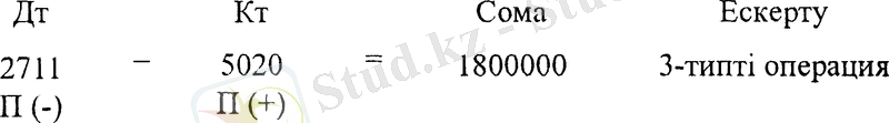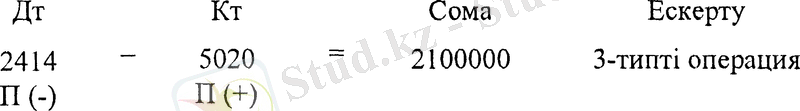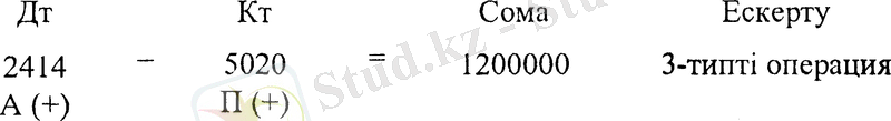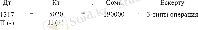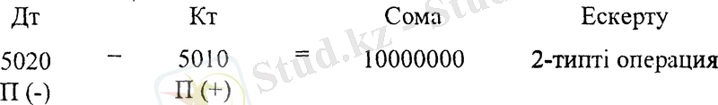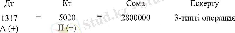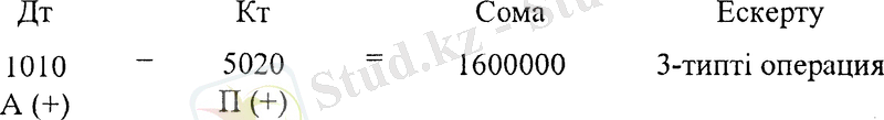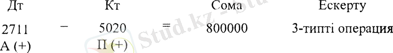 Жазудың дұрыстығын тексереміз: дебеттік жағында тек қана активті шоттар орналасқан. Бұл жағдайда баланстың активі мен пассиві көбейетін 3 типті «Активті-пассивті» операция орын алады. Бір жағынан кәсіпорын активтері мен ақша қаражаттары, екінші жағынан бір мезгілде сол сомаға оның жарғылық капиталының мөлшері көбейеді. Бұл жағдай жазудың дұрыстығын білдіреді.