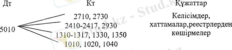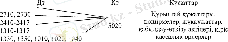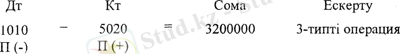 в) Кәсіпорынның акцияларын құрылтайшылар мен акционерлер тарапынан ақша немесе басқа мүлік арқылы алудан. Бұл шаруашылық операциялар №2710, 2730 «Материалдық емес активтер», 2410-2417, 2510, 2520, 2930 «Негізгі құралдар», 1310-1317 «Тауар-материалдық қорлар», 1330, 1350 «Тауарлар», 1010, 1020, 1040 «Ақшалар» активті шоттарында бейнеленеді. Салым ретінде жоғарыда көрсетілген тауар-материалдық құндылықтар дебеттік жағында орналасқандықтан, шаруашылық операцияның жазуы жоғарыдағы шоттардың дебетіне №5020 шоттың кредитінен жасалады. Проводка төмендегідей болады: