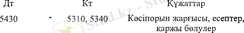 д) Капитал резервтеріне қаржы бөлуден. Бұл шаруашылық операциялар №5430 «Өткен жылдардағы пайда (залал) » пассивті шотында бейнеленеді. Резервтік капитал бөлінбеген пайданың есебінен ұйымдастырылып және кредиттік жағында болатындықтан, шаруашылық операцияның жазуы №5430 шоттың дебетіне №5310, 5340 шоттардың кредитінен жасалады. Проводка төмендегідей болады: