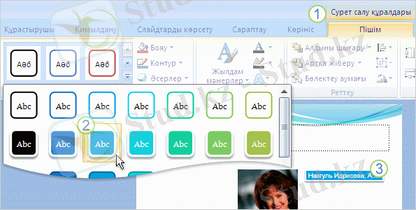 1. Сурет салу құралдарындағы Пішім қойындысында мәтін ұялары мен басқадай кескіндерге арналған мәнерлер бар.