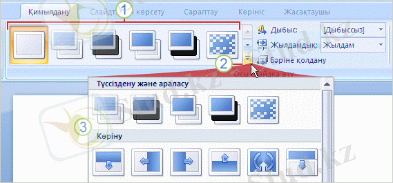 Егер күрделі кешенді қимылдануды қолданғыңыз келсе немесе жаңа ғана қолданған жылдамдықты өзгерткіңіз келсе, осы қойындыдағы Теңшелетін қимылдану тармағын нұқыңыз. Сонымен қатар, бұнда слайдтарға арналған өту әсерлері де бар. Осы әсерлердің мысалы ретінде бір слайдтан екіншісіне ауысқандағы дойбы әшекейі немесе ығыстыруды келтіруге болады.