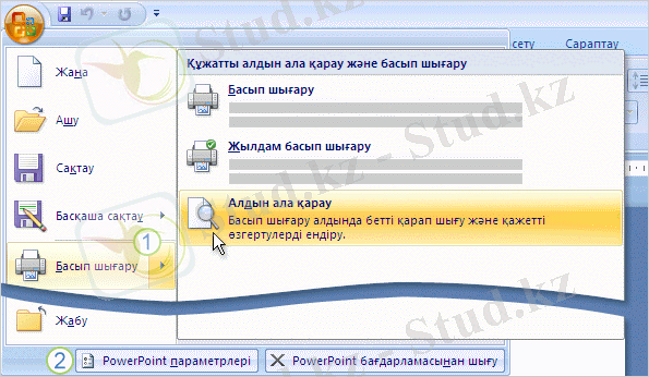 1. Алдын ала қарау тармағын ашу үшін меңзерді Басып шығару түймешігіне апарыңыз.