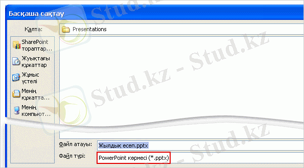 Жаңа файл пішімі PowerPoint 2007 бағдарламасы жаңа файлдарды жаңа пішімде сақтайды. Ескі көрмелерді ашып қана, оларды жаңа пішімде сақтай аласыз. Дегенмен, файл пішімін өзгерту PowerPoint 2007 және PowerPoint бағдарламасының ескі нұсқасының арасында ортақтастырылатын көрмеге әсер етеді. Соңғы сабақта бұл құбылыс толық қарастырылады.