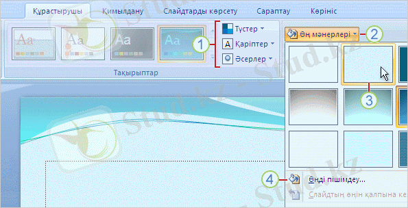 Тақырып слайд жасақтамасына байланысты көрменің көрінісі мен сезімін қамтамасыз етеді. Ол слайдтарыңыз бен слайд элементтеріне өң жасақтамасын, толтырғыш орналасуын, түстер мен қаріп мәнерін қолданады.