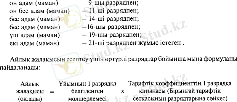 Тарифтік мөлшерлемесін және әртүрлі машықтық - мамандандырылған топтарындағы қызмет иесінің (лауазымды адамның) айлығын жұмыс берушінің ең төменгі жалақыны сақтаған кәсіпорын бекіткен разрядтың мөлшерлемесіне сүйене отырып бірыңғай тарифтік сеткасында белгіленген тарифтік -мамандандырылған коэффициенттер бойынша аныктайды.