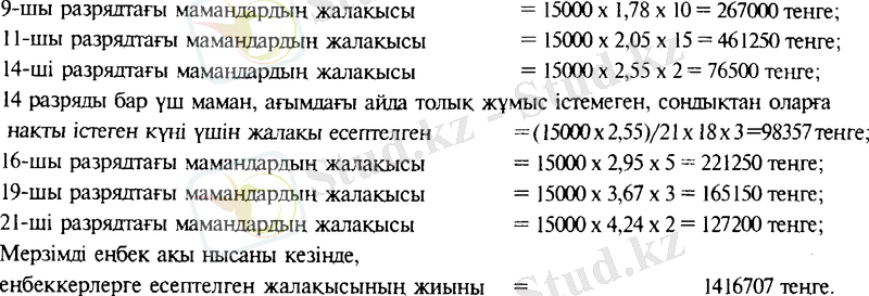 1-ші разрядтың мөлшерлемесін ұжымдық келісім-шартта 15000 теңге мөлшерінде бекіткен. Кәсіпорынның жұмыс тәртібі бойынша аптаның бес күнін жұмыс күні етіп белгілеген (ағымдағы айда 21 күн жұмыс күні болған) . Кәсіпорынның 14-ші разряды бар үш маманы ағымдағы айда 18-ақ күн жұмыс істеген.