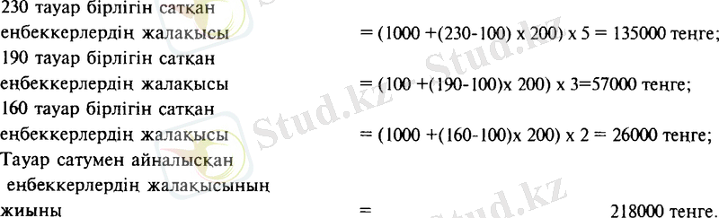 2. Кесімді-прогрессивтік төлем ақысының жуйесі. Сату бөлімінің он жұмыскеріне (еңбеккеріне) келесі еңбек акы белгіленген: 100 тауар бірлігіне 1000 теңгеден және одан әрі сатылатын 100 тауар бірлігіне 200 теңгеден төленетін бес жұмыскері 230 тауар бірлігін, үш жұмыскері - 190 тауар бірлігін және екі жұмыскері - 160 тауар бірлігін сатқан.