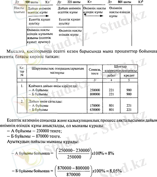Дайын өнімнің нақты өзіндік құны есептік кезең (ай) аяқталғаннан кейін ғана анықталады. Ағымдағы есептік кезеңде өнім тұракты түрде қозғалыста (шығару, босату, жөнелту, сату) болады, сондықтан енім ағымдағы есеп үшін есептік бағасы бойынша шартты түрде бағаланады, ол үшін (есептік бағасы үшін) дайын енімнің еткен айдағы нақты өзіндік кұны, тіркелген бағасы пайдаланылуы мүмкін.