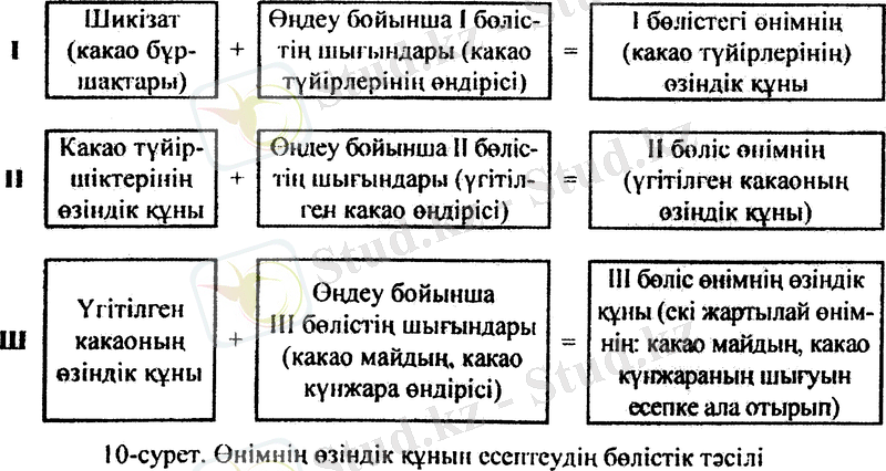 Шоколад өндірісі мысалында өнімнің өзіндік құнын есептеудің бөлістік тәсілінің принципі көрсетілген. Шикі какао-бұршақтарын өңдеу нәтижесінде алынған какао өнімдері басқа жаққа өткізілуі немесе кәсіпорын ішінде шокаладты, шоколад бұйымдарын, шоколад сыламасын және т. б. жасап шығару кезінде негізгі бөліктер ретінде қолданылуы мүмкін (10 сурет) .