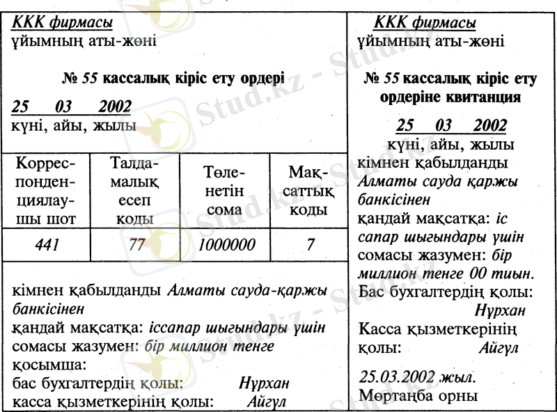 Кәсіпорындар мен ұйымдардың кассасы жұмысшы-қызметкерлерге есептелінген еңбекақы бойынша есеп айырысу үшін, күнделікті көлік құралдарына қажетті шығындарды (жанар-жағар майға) төлеп отыру үшін, кеңсе тауарларын сатып алу үшін, сондай-ақ ұйымның хат және басқа да құжаттарды пошта арқылы жөнелтуі үшін есеп айырысуға арналған. Касса арнайы жабдықталған, яғни дабылдама (дыбыстық белгілер, сигнализация) орнатылған, және ақшаларды сақтайтын сейфі бар бөлмеде орналастыруды қажет етеді. Кассадағы нақты ақшалар касса қызметкерінің мөрі сүргіш (сургуч) арқылы басылып жабылатын сейфте сақталуы тиіс. Бұл сейфтің кілті мен сүргіш (сургуч) басатын мөр касса қызметкерінде, ал кілттің екінші данасы арнайы ыдысқа салынып кәсіпорындар мен ұйымдардың басшысында сақталады. Касса қызметкері әрбір жұмыс күнінің соңында кассаны жауып күзетшіге тапсыруы тиіс. Кассадағы ақшалардың түгелдігіне касса қызметкері, яғни кассир толық жауап береді. Кәсіпорындар мен ұйымдарда кассирлік жұмысқа қызметкер орналасқан уақытта, яғни ұйым басшысы касса қызметкерін тағайындау туралы (жайлы) бұйрыққа қол қойғаннан кейін кәсіпорынмен касса қызметкері арасында материалдық жауапкершілікке келісімшарт жасалуы қажет. Кәсіпорындар мен ұйымдар өздерінің есеп айырысу шотынан нақты ақшаны сол есеп айырысу шоты ашылған банк мекемесі берген чек кітапшасы арқылы ғана ала алады. Банк мекемесінен нақты ақша алу үшін кәсіпорынның касса қызметкері чек кітапшасындағы парақты толтырады. Бұл чек парағын толтыру барысында чекке банк мекемесінен алынғалы отырған, яғни кәсіпорынның жұмсауға тиісті нақты ақшаларының сомасы және бұл соманың қандай мақсатқа жұмсалатындығы жазылып көрсетілуі тиіс. Толтырылған чекке кәсіпорынның бас бухгалтері және басшысы қол қойып, осы ұйымның мөр таңбасы басылады. Барлық толтыруға тиісті ақпараттар толтырылмағанша, чекке қол қоюға болмайды. Сонымен қатар чекке лауазымды адамдардың, яғни қол қоюға тиісті адамдардың қолы қойылмаса (екі адамның қолдары қойылмайынша), мөр басуға рұқсат етілмейді. Кәсіпорындар мен ұйымдардың касса қызметкері банк мекемесінен нақты ақша аларда банк бақылаушысының қатысуымен ақшаны санап алуы тиіс. Сонымен қатар банк мекемесінен алынған нақты ақша сол алынған күні кәсіпорындар мен ұйымдардың кассасына кіріске алынуы керек. Ол үшін кассир кассалық кіріс ету ордерін толтырып, содан соң оны кассалық кітапқа жазады. Кәсіпорынның кассасына қолма-қол нақты ақшаны кіріске алу, яғни қабылдау үшін бас бухгалтердің немесе ол сенім білдірген адамның кассалық кіріс ету ордеріне қол қоюы керек және ақша төлеген заңды немесе жеке тұлғаға осы толтырылған кассалық кіріс ету ордерінің квитанциясы беріледі. Осы нақты ақшаны кассаға қабылдау барысында толтырылатын кассалық кіріс ету ордеріне ұйымның аты, ақша төлеуші заңды немесе жеке тұлғаның аты-жөні, қандай мақсатқа және не үшін ақша төлеп жатқандығы, сол ақшаның төленген уақыты (күні, айы, жылы) жазылып, кассир мен бас бухгалтердің қолдары қойылуы қажет. Кассалық кіріс ету ордері мына үлгілі түрде болады: