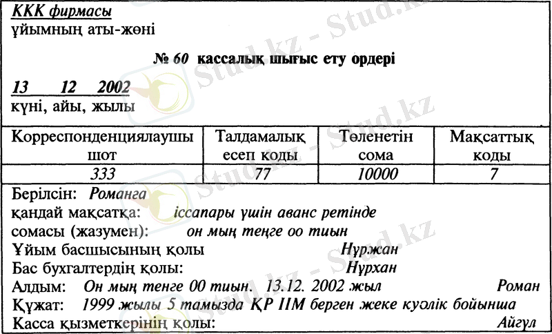 Кәсіпорындар мен ұйымдардың кассасыннан нақты ақша кассалық шығыс ету ордері немесе тиісті үлгілі түрде дайындалған басқа да ақша төлеу тізімдемелері, сондай-ақ кәсіпорындар мен ұйымдардың басшысы мен бас бухгалтерінің қолдары қойылған ақша алу үшін жазылған өтініштер, шоттар тағы да басқа құжаттар бойынша беріледі. Бұл құжаттарға кассалық ордердің деректемесі (реквизиті) көрсетілген мөртаңба (штамп) басылуы керек. Егер кассалық шығыс ету ордеріне қоса тіркелген құжаттарда кәсіпорындар мен ұйымдардың басшысының "рұқсат етемін" деген жазуы және қолы қойылған болса, онда кассалық шығыс ету ордеріне оның қол қоюы аса қажет болып саналмайды. Кәсіпорындар мен ұйымдардың кассасынан адамдарға кассалық шығыс ету ордері бойынша ақша берген кезде касса қызметкері нақты ақша алушы адамның төл құжатын немесе өзі куәландыратын басқа да құжаттарын көрсетуді талап етуі керек. Сонымен қатар касса қызметкері осы көрсетілген құжаттарда жазылған деректерді, яғни ақша алушы адамның аты-жөнін, құжатының нөмірін және ол құжатты кім бергендігін, қай уақытта берілгендігін кассалық шығыс ету ордеріне жазуы тиіс. Кассадан нақты ақша алушы адамдар кассалық шығыс ету ордеріне алып жатқан сомының теңгедегі бөлігін жазумен, ал тиынын сандармен көрсетеді. Кассалық кіріс ету ордері және оның квитанциясы, сондай-ақ кассалық шығыс ету ордері және оның орнына жүретін немесе оған қосымша тіркелетін құжаттарды кәсіпорындар мен ұйымдардың бухгалтерия қызметкерлері сиямен немесе шарикті қаламсаппен анық етіп толтырулары қажет. Бұл құжаттарды өзгертуге олардағы саңдармен әріптерді түзетуге, өшіруге ешқандай рұқсат етілмейді. Кассалық кіріс ету және кассалық шығыс ету ордерлерін немесе олардың орнына жүретін құжаттарды кассаға берместен бұрын бухгалтерия қызметкерлері тіркеу журналына тіркеп жазады. Кассалық шығыс ету ордері мына үлгілі түрде болады: