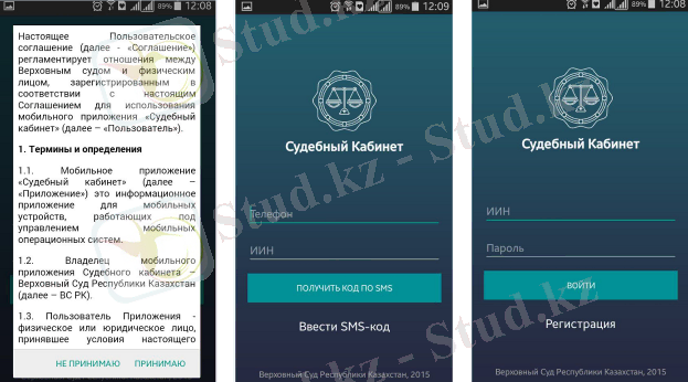 Пайдаланушыларды мобильдік қосымшада тіркеу сервисінің Сот кабинеті веб-нұсқасына қарағанда артықшылықтары бар. Пайдаланушыны тіркеу үдерісі үшін Сот кабинеті сервистерін қолдануға пайдаланушы келісіміне алдын ала қол қойып, пайдаланушының ЖСН және ұялы телефон нөмірін көрсету жеткілікті. Пайдаланушы көрсеткен ұялы телефон нөміріне смс арқылы қосымшада авторлану үшін құпия сөз келеді (Сурет 12) :