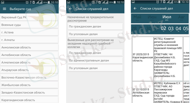 Істерді қарау тізімдері сервисі нақты сот органы бойынша таңдап алу мүмкіндігімен тағайындалған сот отырыстары туралы ақпаратты (өткізу күнін, орнын және уақытын) онлайн режимде табуға мүмкіндік береді (Сурет 15) :