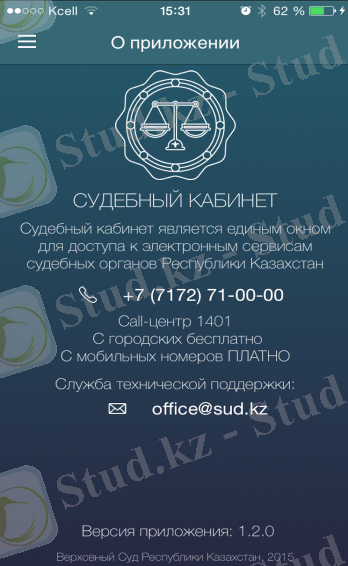 Осы сервис техникалық қолдау көрсету call - орталықтарының байланыстарымен танысуға, сондай-ақ Қосымша жұмысымен байланысты сервистер жұмысын жақсарту және/немесе проблемалар бойынша ұсыныстар туындаған жағдайда Сот кабинеті техникалық қолдау қызметіне office@. sud. kz электрондық адресіне жазуға мүмкіндік береді (Сурет 2) :