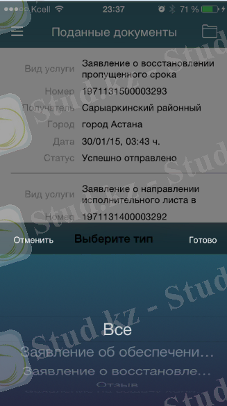 Сурет 6 - «Тапсырылған құжаттар» сервисі → Өтініш типін таңдап алу