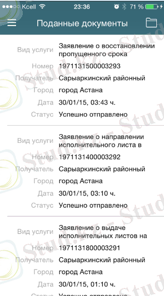 «Тапсырылған құжаттар» сервисі қосымша пайдаланушысына мобильдік қондырғыға жүктеу мүмкіндігімен сот органдарына Сот кабинеті веб-сервисі арқылы жолданған барлық құжаттарды көруге мүмкіндік береді (Сурет 6, Сурет 7) :