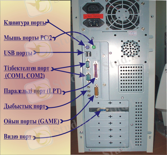 Тізбектелген (последовательный) порт. Бұл тізбектелген құрылғыларды (яғни тізбектеліп берілетін информациялар биті) қосуға арналған: модемдер, принтерлер және т. б. Параллельді порт. Параллельді принтерлерді және ауыспалы тасымалдағыштағы кейбір сыртқы жинақтағыш түрлерін қосуға арналған. VGA видео порты. Бұл сіздің мониторыңызды қосатын орын. Клавиатура порты. Мұнда сіздің клавиатураңыз жалғанады. Ол үлкенірек АТ-сияқты разъем немесе кішірек РС/2 сияқты разъемдардың біреуінен тұрады. USB порты (Universal Serial Bus) . Бұл 127 құрылғы жалғауға болатын 12 МБит/сек. жылдамдықпен мәліметтерді беру мүмкіндігі бар интерфейс.