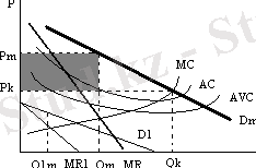 Тепе-теңдік саны сұраныс деңгейімен шарттасылған болғандықтан, монополия кезінде де барлық масштаб эффектісін пайдалану мүмкін (D 1 , MR 1 ) . Бірақ оның себебі болып бәсеке емес, MC = MR 1 болатын сұраныс деңгейі табылады.