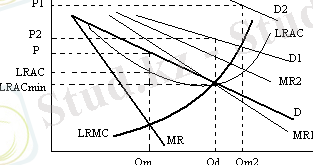 Сонымен бірге шығындарды минималдау көзқарасынан өндірістің қолайлы масштабын таңдау мәселесі монополиянын да алдында тұр, өйткені басқа тең шаралар кезінде үлкен пайда алуға мүмкіндік береді. Монополист саладағы жалғыз сатушы болғандықтан, өндірісті бір емес, әрқайсысы шығындардың минималды деңгейін қамтамасыз ететін бірнеше зауыттарда жүзеге асыру арқылы пайданы өсіре алады. Бұл MR=LRACmin кезіндегі сұраныс, минималды ұзақмерзімді орташа шығындарды қамтамасыз ететін шығарылымға қысқартылған жағдайда мүмкін (сурет 5) .