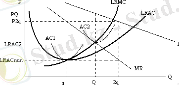 Нарықтық сұраныс өскен жағдайда монополист бір зауытта өндірісті кеңейту жолымен ұсынысты Q көлеміне дейін арттыра алады. Бұл жағдайда, өндірісті минималды ұзақмерзімді орташа шығындармен AC 2 жүзеге асырып, ол LRAC 2 деңгейіндегі ұзақмерзімді орташа шығындарға ие болады, бұл q-ге тең шығарылым көлемі үшін олардың минималды мәнін бейнелі арттырады. Егер сұраныс сипаты минималды орташа шығындар беретін, шығарылым көлеміне қысқаратын деңгейде ұсынысты оңтайландыруға мүмкіндік берсе, онда q масштабты екі зауыт салып, монополист жалпы ұсынысты 2q-ге дейін өсіреді, бұл минималды ұзақмерзімді орташа шығындармен ұсынысты жүзеге асырғанын білдіретін болады, мұнда MR=LRMC=LRACmin. Нәтижесінде, нарықтық бағаның P Q ден P 2q деңгейіне дейін төмендеуіне қарамастан, монополисттің жалпы пайдасы өндірістің орташа шығындарының төмендеуінен сияқты, ұсыныстын өсуіне байланысты өседі. Сонымен, пайданы максималдауға тек екі зауытта да өндіріс факторларын пайдаланудың бірдей тиімділігін қамтамасыз еткенде ғана жетеді.