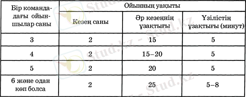 Ойынның үзақтыгы - әрқайсысы 45 минут болатын 2 ке-зеңдік ойын. Мектеп оқушыларында оның ұзактығы, ойын-шылардың саны, жасы және дайындыгына байланысты өр түрлі болады.