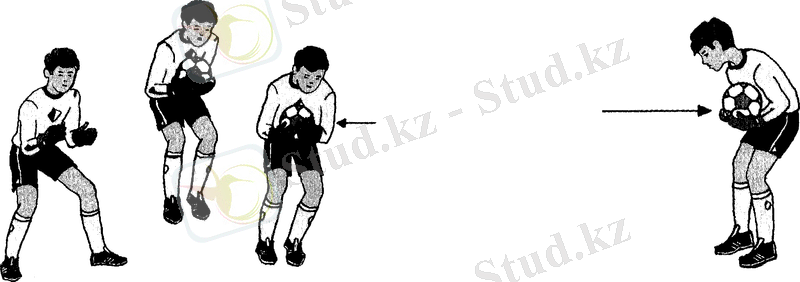 Егер доп қақпашыдан қашықтау үлкен жылдамдықпен үшып бара жатса, онда қақпашы доп багытына қарай ұмты-ла секіріп барып кұлау арқылы ұстайды. Жерге әуелі бал-тыр, сан, кейін кеуде бүйірі, иық және доп ұстаган қол тиеді.