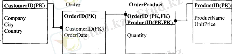 Мысал ретінде азық - түлік қоймасынан тұтынушыларға қызмет көрсету мәселесіне қатысты ЗNҒ шартын қанағаттандыратын 4 реляциялық кестелерден тұратын МҚ карастырайық (1-сурет) .
