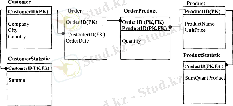 Бұл кестелерге МҚ қолданғаннан бастап қоймадан сатылған әрбір заттың санын есепке алатын ProductStatistic және әрбір тұтынушының қоймаға төлеген жалпы сомасын сақтайтын CustomerStatistic кестелерін қосайық (2-сурет) .