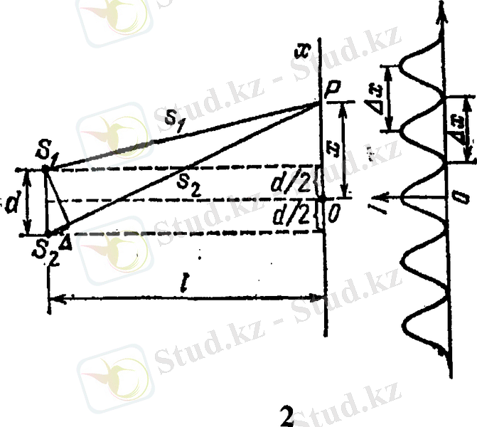 Ол нүкте экранның ортасынан х қашықтыққа орналасқан. 2 - суретінде біз S 1 және S 2 -ге перпендикуляр орналасқан экран жазықтығында жатқан х осін алдық. О нүктесінде координатаның бас нүктесі орналасқан, d мен x қашықтықтарын өте аз шамалар деп есептеп, жуықтап мына теңдікті жазамыз.