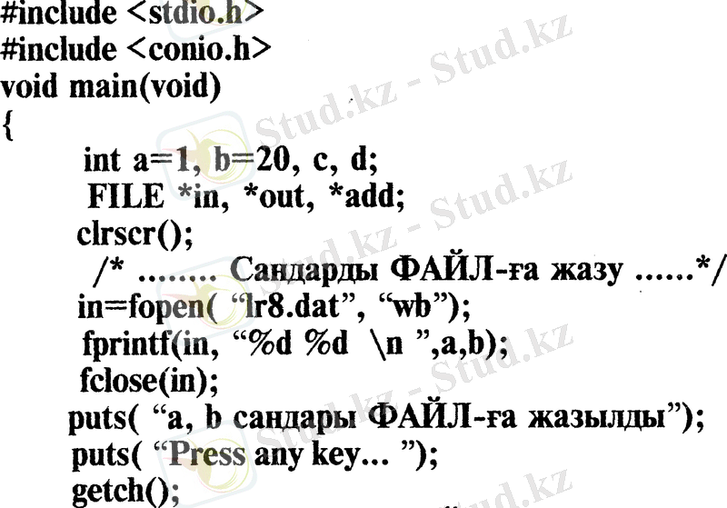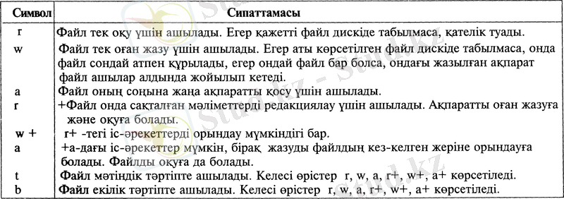 Мұндағы " r " символы ашылатын файлға хабарласу құқығын анықтайды. Қарастырылып отырған мысалда В:\ дискісіндегі LR7. СРР файлы оны тек оқу үшін ашылып отыр.