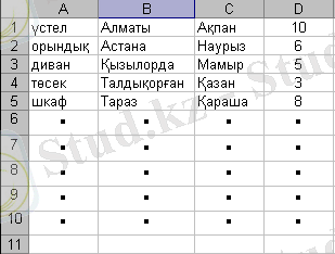 - А1:D1 ұяшықтарына сәйкесінше мәліметтер базасы өрісінің тақырыптарын енгізіңіз:Ай, Жеткізуші, Жиһаз, Саны.