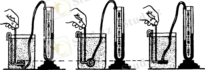 Паскаль заңы. Қысым бергішті суы бар ыдыстың ішіне салайық. (1-сурет) . Манометрмен берілген биіктіктегі судың қысымын анықтайық, қысым бергіш орналасқан тереңдікті өзгертпей, арнайы жабдықты пайдаланып қысым бергішті 45º бұрышқа бұрайық,